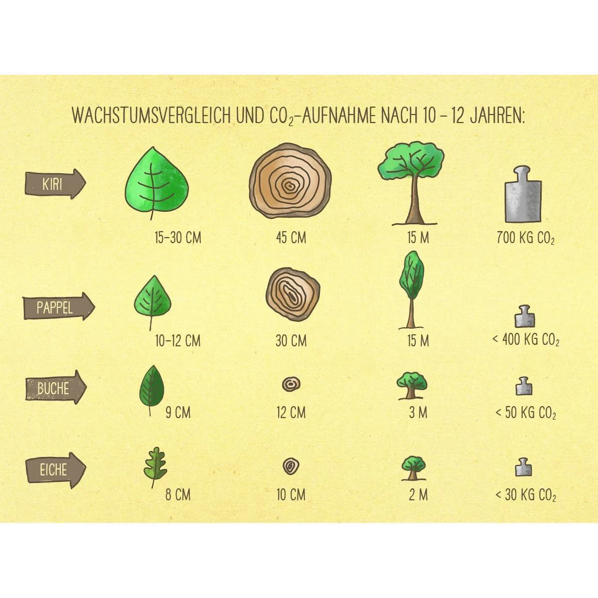 Der Blauglockenbaum, Kaiserbaum, Kaiser-Paulownie oder Kiri-Baum, wie der Blu CO2-Klimabaum ‚NordMax21‘ ® auch genannt wird, braucht einen leichten bis mittelschweren, neutralen Boden und einen sonnigen, geschützen Standort. Ist der Ton- bzw. Lehmanteil zu hoch, kümmert er, bzw. geht ganz ein. Für eine ungestörte Entwicklung braucht er außerdem eine freie Fläche von etwa 3-4 m im Radius. Er sollte nicht vor Mitte Mai und spätestens 3 Monate vor dem ersten Frost ausgepflanzt werden, da die Jungpflanzen recht kälteempfindlich sind und nicht gleich Frost vertragen. Außerhalb dieses Zeitfensters kann der Baum an einem hellen Standort in großen Kübeln und Gefäßen kultiviert werden, an dem auch im Winter eine Mindesttemperatur von 5-8 °C gewährleistet ist. In den ersten drei Jahren nach Pflanzung sollte bei Trockenheit im Sommer gut gewässert werden. Der Wurzelballen sollte nur so tief gesetzt werden, dass er ebenerdg abschließt. Ein Pfahl oder eine andere Stütze ist nicht erforderlich und wegen des außergewöhnlich schnellen Wuchses auch nicht ratsam. Wir empfehlen allerdings in Regionen mit vielen Wildtieren einen Verbissschutz anzubringen. Der Schnitt des Blu CO2-Klimabaums ‚NordMax21‘ ® erfolgt in den ersten drei Jahren nach dem Neuaustrieb im Mai der Juni. In der Regel treibt er dann einen oder mehrer Seitentriebe aus dem Boden, der Haupttrieb des Vorjahres ist abgestorben. Das ist ganz normal. Er sollte, zusammen mit den schwächeren Seitentrieben abgeschnitten werden. Der stärkste Seitentrieb wird so zum neuen Haupttrieb. Je nachdem, welche Wuchsform kultiviert werden soll, werden auch in den Folgejahren die Seitentriebe am Haupttrieb entfernt, oder stehengelassen. Im ersten Fall entwickelt sich der Baum zu einem Hochstamm mit lockerer Krone, im zweiten Fall bildet sich eine pyramidenförmige Gestalt heraus.